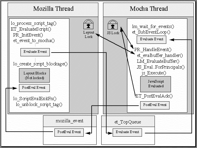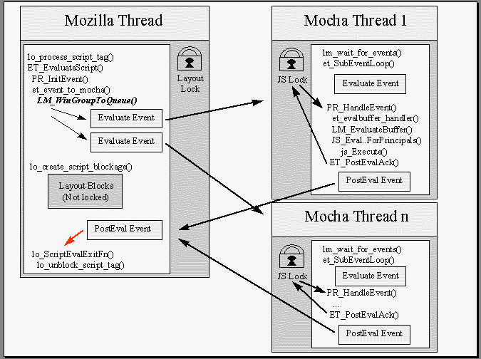 There is only one JavaScript thread in the client. This thread can process only one script at a time. Using LiveConnect and other mechanisms, there are ways to make blocking calls in JavaScript. When a call blocks, the script that is currently being parsed stops until the call returns. If another script needs evaluation while the original script is blocked, the second script blocks until the JavaScript thread lock is available. Note: The terms "Mocha thread" and "JavaScript thread" are used interchangably here; the code refers to the thread as the "Mocha thread" because JavaScript was originally named "Mocha".