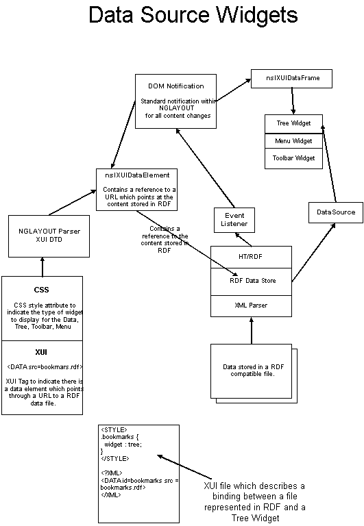 Extending to other widgets Initially only the tree widget, menu, and toolbar will be implemented as DataSource widgets. These widgets will commonly have their contents defined by external sources. In the future other widgets could become data source widgets. Non-external sources Each of the DataSource widgets will include DataSource class which actually stores the contents of the widget without relying on an external data source to provide content for it. Integration with NGLAYOUT