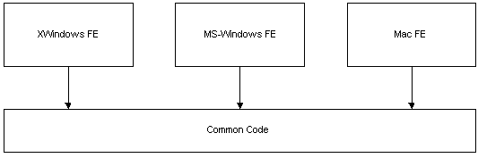 OverviewIn the past there were three (or more) separate "front-end" code bases developed for the browser, composer, etc. The main toolkits being MS-Windows, X-Windows and Macintosh. A separate graphical user interface or GUI was created with platform specific code. A simple view of the architecture was as follows: