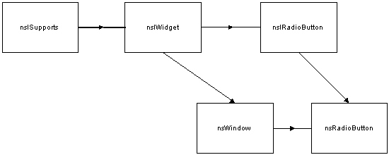 Interfaces and InheritanceIn the widget toolkit the nsIWidget interface is responsible for all basic widget functionality. For example, SetBounds, GetBounds, SetEnabled, IsEnabled etc. The nsIXXXWidget interface would specify widget specific behavior. For example, the nsIRadioButton would have an unique "IsChecked" method.On the surface mulitple inheritance of interfaces seems like a very useful approach. On MS-Windows all widgets are windows. If we take a look at a specific example, several issues will emerge. For instance, a nsIRadioButton inherits from nsIWidget. The interface hierarchy could be: nsIWidget->nsIRadioButton. The implementation hierarchy would then be nsWindow->nsRadiobutton.