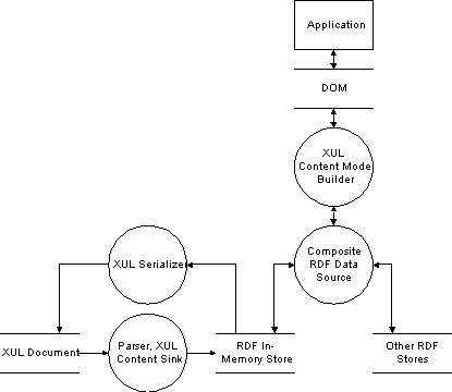 If you've read this far, you should now have a general idea of what the architecture is like, as well as the motivations for choosing such an architecture. Now it's time to fill in some of the details by mentioning XUL and RDF specifically. A picture (provided by Chris Waterson) of the XUL/RDF architecture is shown below.