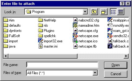Select the "Attach" button from the Toolbar and then "File..." from the drop down menu. The "Enter file to attach" dialog is opened.
