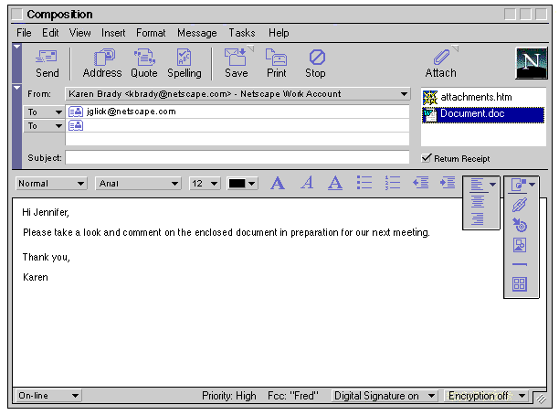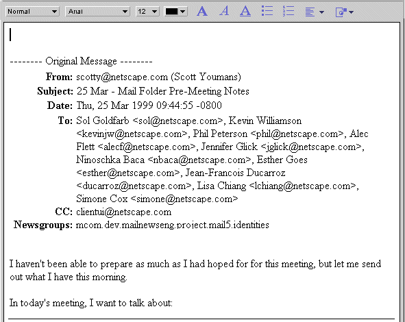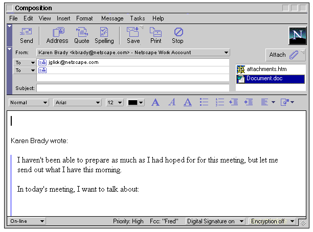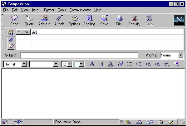 - "From" non-editable dropdown list is added. If a user has multiple accounts, they can choose from which account the message will be show as from. This drop down menu will display a list of multiple accounts for the current user. If no other accounts are available, there are no other options in the list. The user defined account name is not displayed as part of the message header when messages are sent (i.e., "Netscape Work Account").