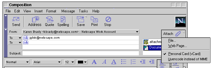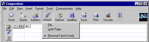 - "Uuencode instead of MIME" is moved from the "Options" Tab onto the "Attach" Toolbar button drop down menu. Similar to the currently implementation of vCard, users can turn this feature on or off on a per message basis. When a new message is launched, the default is always what the user specified in their Preferences. Since this item is directly related to attachments, it is suggested it be relocated here.