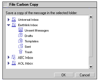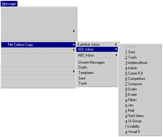 This feature allows users to save a copy of a message being sent to a user specified folder on a per message basis. Since this is a feature intended for more advanced users, it is accessible via a menu dropdown only. A "Message" menu drop down will be added for the Message Compose window.