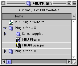 Installation Instructions1. Download the MRJ Plugin. Your browser should automatically unstuff the file "MRJPlugin.sit.hqx" as the folder "MRJPlugin." 2. Open the "MRJPlugin" folder, and choose "as List" from the "View" menu in the Finder. You'll see the following items: ![]() 3. Move the files "MRJ Plugin" and "MRJPlugin.jar" from the "Plugin for 4.X" folder to your browser's "Plug-ins" folder. (The "Plugin for 5.X" folder contains a build of the plugin suitable for the Gecko-based browser.) 4. Installation is now complete. Test your installation by opening the console applet with "LaunchConsole.html" which is in the "ConsoleApplet" folder. This page last modified on March 21, 1999.