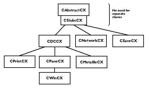 Given any CStubsCX instance, you can load a URL. It won't do anything except perhaps go into the cache. Derived from CStubsCX is the great behemoth, CDCCX. The operative letters in the name are DC, a Windows term. DC refers to the device context through which you draw, so if you need to create any type of drawing to a new device, you derive from CDCCX. Also, CDCCX is the easiest place to implement drawing code, because the print engine and the window display engine automatically benefit. The other letters in this and the other class names in this section are the initial C which stands for "class," and the trailing CX which indicates that the class implements the interface for an MWContext structure.