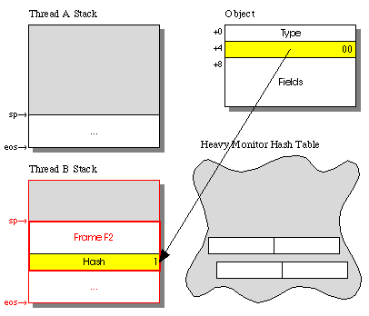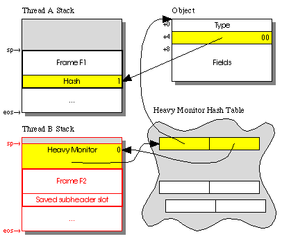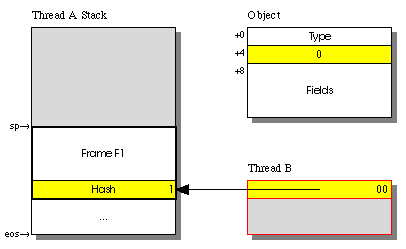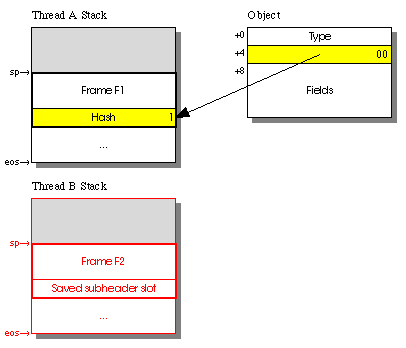 If the object is unlocked, we can read the hash code directly from it. If it is locked by our thread, we dereference the pointer in the object's subheader to get the saved subheader and read the hash code from that. If the object is locked by some other thread, we must temporarily put the object's subheader into the busy state so we can read that thread's saved subheader word without worrying about that thread exiting from a MonitorExit and destroying its saved subheader word in the meantime. After reading the saved subheader word we restore the object's subheader into its previous state. Here's an example of this process: