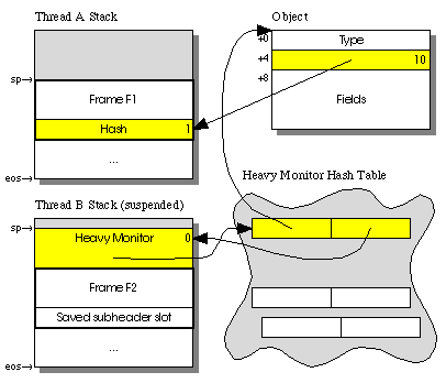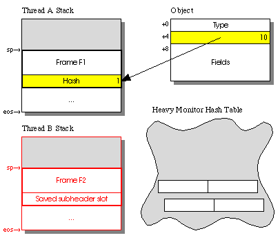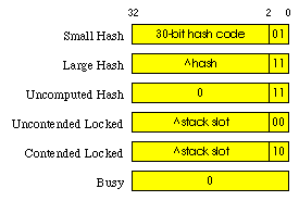 On a 32-bit address machine we pack both an object's monitor and its hash code into a single word -- the object's subheader at offset 4 in the object. Figure 1 shows the placement of the subheader in an object and lists the possible states of the subheader.