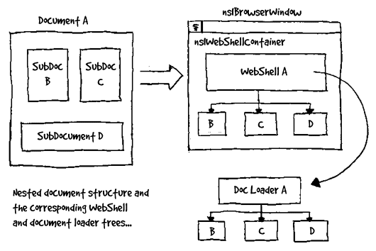 It is important to remember that while there may be many nested WebShells representing a document only the outermost WebShell container supports the nsIBrowserWindow interface.  Below is a diagram which illustrates the relationships between nested documents, WebShells and document loaders.
