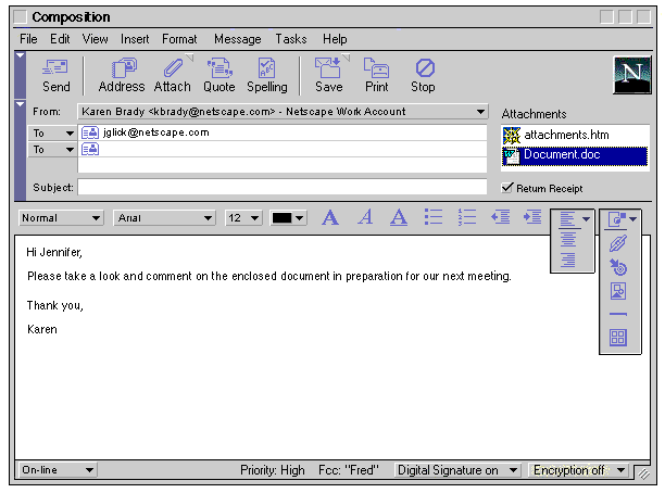 • What items do we want to appear in the addressing area (Priority, Attach, Format, Save a copy, Return Receipt). For now (!), Format, Return Receipt and Priority. Mail Issues meeting 3/18/99.