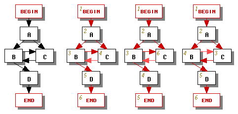 If a control graph is reducible, it contains only regular backward edges (see page 663 of [ASU86]). If the control graph is irreducible, it will include at least one irregular backward edge. The set of irregular backward edges will vary depending on how we choose to traverse the control graph in the depth-first search -- see the three possible traversals in Figure 1 which result in different designations of forward edges (dark red) and backward edges (light red). To avoid inconsistencies we will choose one depth-first traversal and use it consistently throughout the translator's phases.