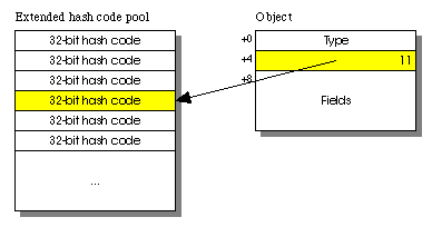 When an object's hash code is negative or greater than 0x3FFFFFFF, it needs to be stored outside the object. Such hash codes can occur for strings longer than six characters. We put them into a separate area of memory called the extended hash code pool. Each hash code in that pool is a word that belongs to one and only one object in memory. We can link free pool words into a linked list if desired. We deallocate a pool word when we deallocate its object.