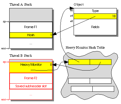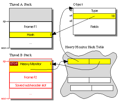 If the object is unlocked, we can read the hash code directly from it. If it is locked by our thread, we dereference the pointer in the object's subheader to get the saved subheader and read the hash code from that. If the object is locked by some other thread, we must temporarily put the object's subheader into the busy state so we can read that thread's saved subheader word without worrying about that thread exiting from a MonitorExit and destroying its saved subheader word in the meantime. After reading the saved subheader word we restore the object's subheader into its previous state. Here's an example of this process: