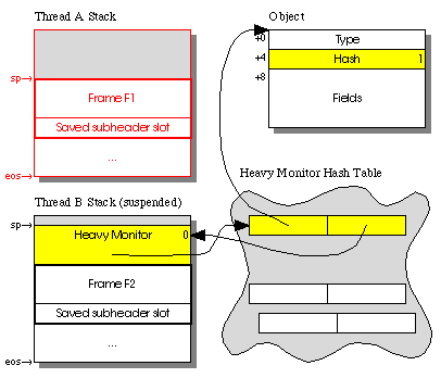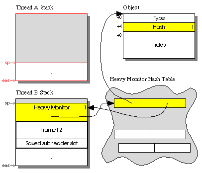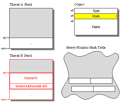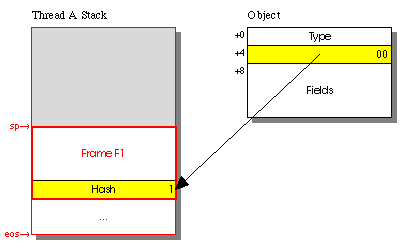 On a 32-bit address machine we pack both an object's monitor and its hash code into a single word -- the object's subheader at offset 4 in the object. Figure 1 shows the placement of the subheader in an object and lists the possible states of the subheader.