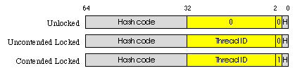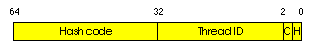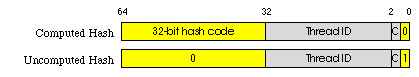 On a 64-bit address machine we put an object's monitor and its hash code into a single doubleword -- the object's subheader at offset 8 in the object. Figure 1 shows the placement of the subheader in an object. Figure 2 shows the layout of the bits in the subheader.