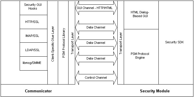 The Protocol LibraryThe protocol library encodes and decodes messages passed along the control channel. The protocol library is shared between the client library and the PSM daemon.The Client Library API The client library API manages connections to PSM, and provides client-side abstractions for objects and services contained within PSM. Eventually, this API will grow to resemble a subset of the NSS API, with higher-level functions and UI facilities added for ease of integration. The PSM GUIPSM may require user input to perform certain operations. The application may choose from one of two methods for dealing with these exceptional conditions. The application may allow PSM to use its own built-in HTML dialog-based GUI, which is similar to the security UI curently implemented in Communicator. The other option [currently not implemented] is for PSM to send messages back to the application requesting the information required to continue.When PSM requires user feedback and it is configured to use the internal HTML dialog-based GUI, the following process is used to display the dialog and get back the results:
