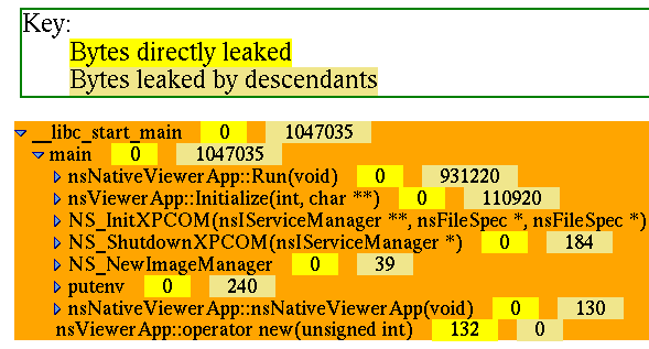 (gdb) p DumpAddressMap() leaky -d -a <program-name-goes-here> malloc-log > log Leaky now has a "graph" output option. If you do this: leaky -gqx <program-name-goes-here> malloc-log | c++filt | sed -e 's/&/&/g' > /tmp/GQ0.html Then leaky will make a graph of the leaks [-g] and output that graph in xml format (currently actually html...) [-x]. I use c++filt to translate the C++ mangled names into ascii and then use sed to make it legitimate html and off it goes to a file. If you throw file at viewer (recursion is cool) then it will present you with a treeview of the leaks that you can click on to open/close sections. Screenshot below, on a test run of viewer. Enjoy!